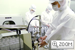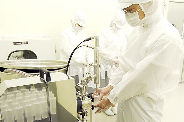 化粧品の製造工場には、試験研究室、秤量室、製造室、充填室などの施設があり、実際に製造を行う施設は、医薬品製造工場レベルに匹敵する衛生管理がなされています。人と物の動線分離、クリーンルームとその他のエリアの差圧管理、1日1時間の機械洗浄などでホコリやゴミなど異物の混入を防ぐことはもちろん、厳密な温湿度管理で出荷直前まで完成直後の状態をた持ち続けるなど、安心してご使用いただける品質の維持に努めています。